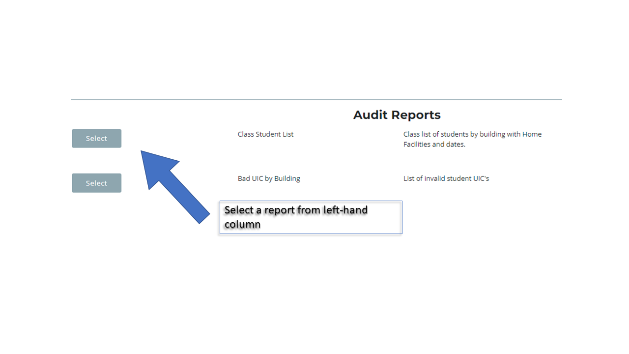 To access reports visit: cteis.com and use login credentials. Select Reports from the top menu bar and then select Building Reports from the drop-down menu. Under the Audit Reports header on the Building Report Launcher page, choose a report to review and click the select button on the left side. The next page will prompt you to select building from a drop-down menu. On the next page, Select the criteria from the right-hand panel (sort by enrollment, CIP Name, and Year).